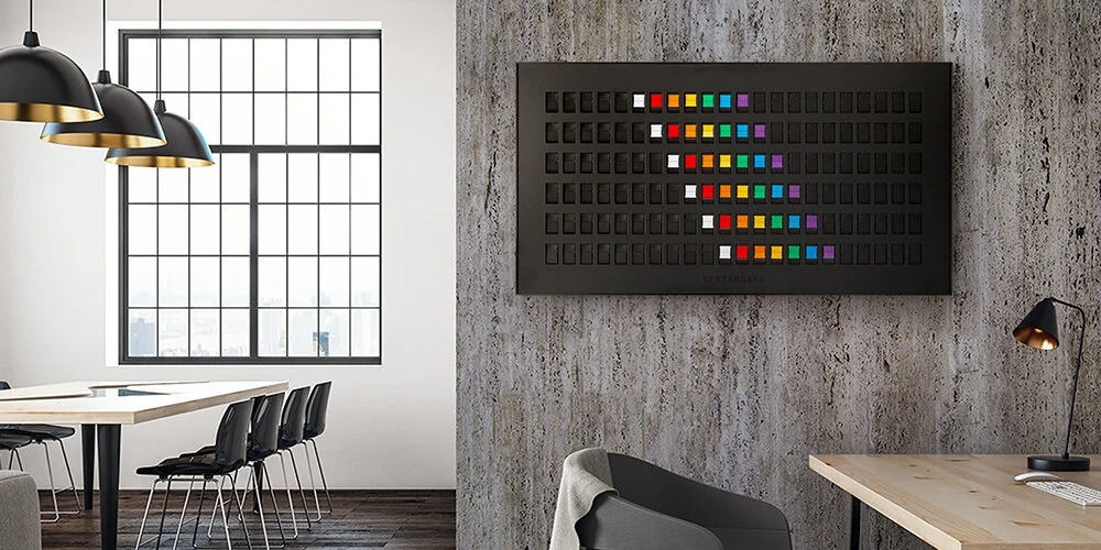 Vestaboard is a new modern, more intimately sized take on the vintage split-flap displays used in train stations the world over. Its mesmerizing mechanics can be used to inspire anyone with a profound daily quote, display menu specials or warmly welcome guests. The mobile app lets you update your Vestaboard from anywhere or automate messages. The color flaps make it possible to compose artful, multi-hued compositions.